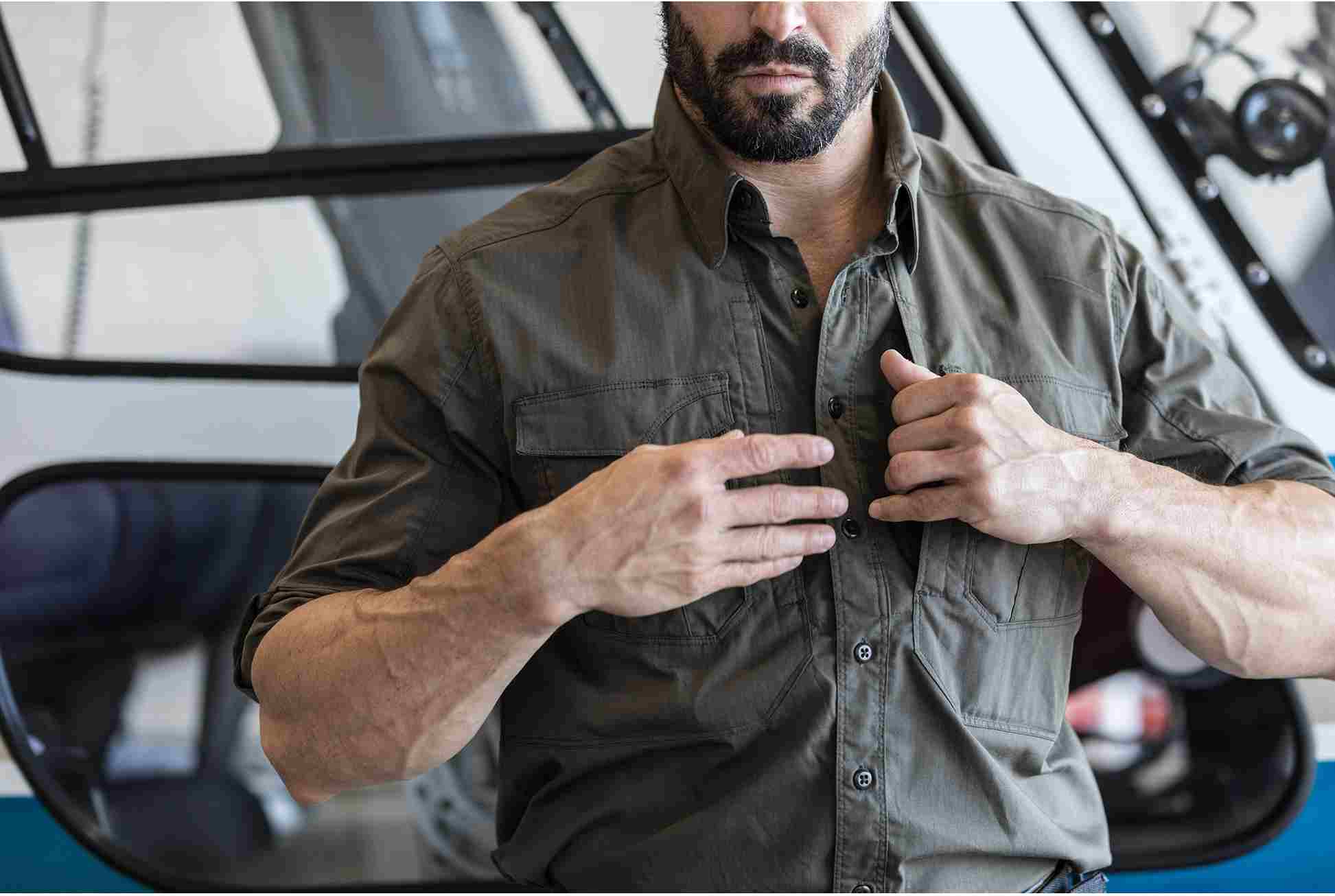 Мужская рубашка 5.11 Stryke ™ Short-Sleeve Shirt изготовлена из прочной и эластичной ткани Flex-Tac® с тефлоновым покрытием для защиты от воды, пятен и грязи.
